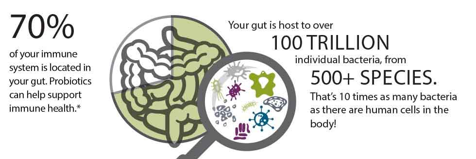 Khoảng 70% hệ thống miễn dịch của cơ thể nằm ở ruột. Bên trong thành ruột có các vùng đặc biệt gọi là mô lymphoid liên quan đến ruột giúp sản xuất và lưu trữ các tế bào miễn dịch giúp giám sát miễn dịch những gì đi qua ruột. Chúng nhận biết, xác định và trung hòa bất kỳ chất có hại nào xâm nhập vào cơ thể.